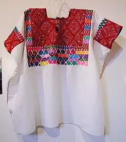Both traditional and non-traditional clothing is made in the state. The basic traditional garment for women is the huipil, and each indigenous community has its own style,[8] particularly in Tenejapan, Zinacantan, Ocosingo, Larrainzar, Venustiano Carranza.[4] Another traditional dress is called the Chiapaneca, which shows clear Spanish influence. It is usually made of light, transparent cloth in dark colors (usually tulle) and heavily embroidered with large bright colored flowers.[8] In addition, mestizo women sew traditional and non-traditional clothing items for the tourist market, contracting indigenous women to do the embroidery.[3] These garments and other items with traditional embroidery can be found in markets such as those in San Cristóbal de las Casas (Plaza Santo Domingo), San Juan Chamula and Zinacatán.[1]