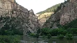 Hanging Lake is a lake in the U.S. State of Colorado. It is located in Glenwood Canyon, about 7 miles (11 km) east of Glenwood Springs, Colorado and is a popular tourist destination. When open, the lake is reached via a trailhead located along the Glenwood Canyon Bike and Pedestrian Path that runs along the north side of I-70 in the bottom of the canyon. The trail follows Dead Horse Creek, a tributary of the Colorado River and ascends some 1,000 feet (300 m) in elevation for 1.2 miles (1.9 km) from the trailhead to the lake.[2]
