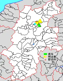 * yellow - areas formerly within the district borders during the early Meiji period