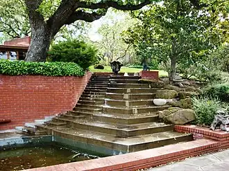 The house is one-story high with a central clerestory[9] (an outside wall of a room or building that rises above an adjoining roof and contains windows) and is constructed of native redwood board[7] and batten, common wire-cut San Jose brick,[5] concrete and plate glass. The house clings to, and completes the hillside on which it was built as the floor and courtyard levels conform to the slope of this one and one-half acre site. The entire site includes the main house, a guesthouse, hobby shop, storage building, double carport, breezeway, and garden house with pools and water cascade.