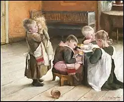 The corpus of work of Hanna Frosterus-Segerstråle can roughly be divided into three time periods. In the earlier part of her career she painted intimate scenes of family life and notably her own inner circle of family and friends; these works have been compared to those of Carl Larsson.[1] Gradually but approximately after 1892, she began to focus more on portraits. After c. 1920, the main focus of her art work was religious motifs. Throughout her life she worked mainly in pastel but occasionally also with other methods. Her paintings Méditation (1888) and En liten patient ("A little patient") (1889) have been described as some of her best work.[1][2]