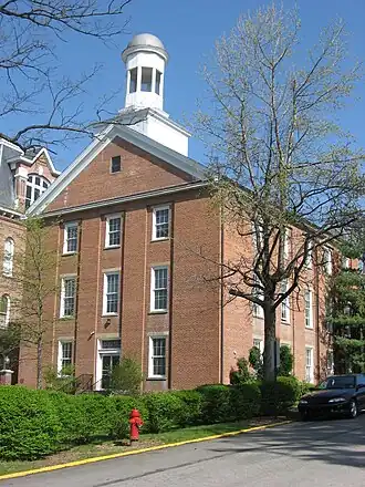 Situated directly to the east of Miller Hall, Hanna Hall was built in 1851, and is a three-story, rectangular red brick building, which was designed in the Federal-style. It has a gable roof topped by a wooden bell tower.