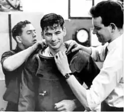 Keller donning diving dress at the United States Navy Experimental Diving Unit[7]
