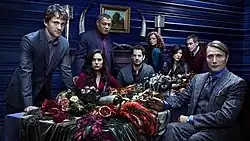Several first season main and recurring Hannibal cast members, from left to right: Dancy (Will Graham), Dhavernas (Alana Bloom), Fishburne (Jack Crawford), Abrams (Brian Zeller), Chorostecki (Freddie Lounds), Park (Beverly Katz), Thompson (Jimmy Price), Mikkelsen (Hannibal Lecter).
