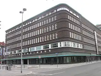 The Hans-Sachs-Haus (HSH) is a landmark building in Gelsenkirchen, North Rhine-Westphalia, Germany, constructed between 1924 and 1927. Named after the Meistersinger Hans Sachs, the building was designed by Essen-based architect Alfred Fischer. The outside of the modernist building represents Brick Expressionism, New Objectivity (German: Neue Sachlichkeit) and Streamline Moderne, as well as Bauhaus influences which also characterize its interior. The building covers a floor area of about 27,500 square metres (296,000 sq ft).