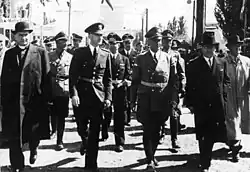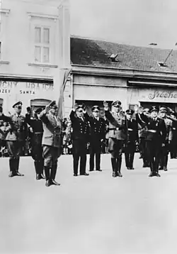 At the beginning of September 1941, Globke accompanied Interior Minister Frick and State Secretary Stuckart on an official visit to Slovakia, which at that time was a client state of the German Reich. Immediately following this visit, the government of Slovakia announced the introduction of the so-called Jewish Code, which provided the legal basis for the later expropriations and deportations of Slovak Jews. In 1961, Globke denied there was any connection between the two events and the allegation that he had participated in the creation of the Code. Clear evidence for it was never verified.[31] According to CIA documents, Globke was possibly also responsible for the deportation of 20,000 Jews from Northern Greece to Nazi extermination camps in Poland.[32][33]