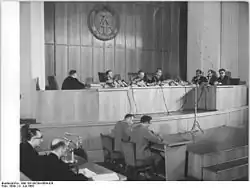 In July 1963, the trial, a show trial, was held in the Supreme Court of East Germany which was presided over by Heinrich Toeplitz.[69] Because an extradition of Globke to the East was unrealistic, the trial was not held with the expectation of holding Globke accountable for his crimes. It nonetheless still had propaganda value in publicizing his role in the Nazi era and in drawing attention to the continuity between the Federal Republic and the Nazi regime, in contrast to the self-styled antifascist image of the Democratic Republic.[70] On 23 July 1963, Globke was sentenced in absentia,[71][72] to life imprisonment "for continued war crimes committed with complicity and crimes against humanity in partial combination with murder".[73] In the trial and in the extensive reasons for the verdict,[74][75] the court tried to prove the alleged "similarity of essence of the Bonn regime" with Hitler's terror state.[76]