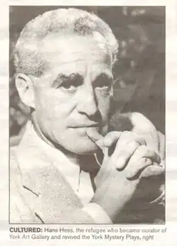 In early 1944 he was appointed Assistant Keeper of Art under the director Trevor Thomas (1907–1993) to Leicester Museum and Art Gallery just before the opening of an exhibition, which ran from 5–27 February 1944, titled 'Mid-European Art', which was supported by the Free German League of Culture.[3][4] Hess was promoted to Keeper of Art following Thomas' sudden and forced departure in 1946. Later, he was appointed curator at York Art Gallery in 1948, when the gallery reopened after being bombed during the Second World War. He lived with his wife (and fellow German refugee) Lillie Williams and their daughter Anita at 56 Skeldergate in York.[2]