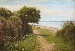He had his debut at the Charlottenborg Spring Exhibition with Et Bondehus (1875) and painted street life pictures in the years from 1876-1878. In 1879, he painted 3 Piger (1879) which along with two other pictures was bought by Kunstforeningen.[1] He preferred painting rural scenes and soon discovered his increasing interest in depicting animals. He also became a capable landscape painter, having a particular skill for representing men and animals and the space surrounding them as can be seen in En ung Pige, som giver en Hest Brød (1880).[1]
