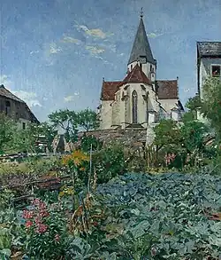 He was a founding member of the Vienna Secession.[2] He was elected to the presidency of the group in 1902.[3][4] His painting, At the Fountain of Love, was exhibited with the group;[5] it won him the Reichel Prize from the Academy,[6] and it was bought by the Moderne Galerie (now the Österreichische Galerie Belvedere).[7]