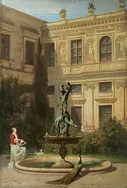 In the 1880s Marées painted four monumental triptychs: The Judgment of Paris, The Hesperides, Three Saints on Horseback and The Wooing.[3] During this time he also produced smaller mythological paintings and some portraits.[6] He spent these last years of his life in Rome, supported by Fiedler.[1] He died there in 1887, at the age of 49, and was buried in the Protestant Cemetery.