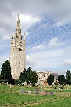 The Perpendicular Gothic[17] church spire is a prominent feature of the village and surrounding landscape. It was originally built early in the 15th century and was 200 feet (61 m) high.[17] In 1804 it collapsed after being struck by lightning and afterwards it was rebuilt to the slightly lesser height of 186 feet (57 m).[19] However, it is still the tallest in Buckinghamshire.[19] The church has an open day each summer, when the tower is open to the public.