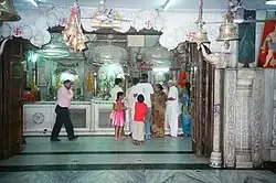 As the idol of Hanuman faces the southern direction, devotees can discern only one eye of the idol. The idol depicts a Gada (mace or club) in the left hand with the right hand crossed across the chest showing veneration to the adjacent idol of lord Rama, Lakshmana and Sita.[6] A tapering crown adorns the idol, which has a sacred thread on the right shoulder and is clad in a fashioned dhoti.[2][4] The height of the temple is reported to be 108 ft (32.9 m).[7] The ceiling of the main mandap (hall or pavilion) depicts the epic story of Ramayana artistically painted. In recent years, the New Delhi Municipal Corporation (NDMC) has enhanced the religious character of the temple precincts by incorporating within the main complex a shrine to Shiva, Parvati and their children, of the same size as the adjoining main sanctum, another enclosure housing idols of Durga, Lakshmi Narayan and Ganesha and on the south in an annex the idol of goddess Santoshi Mata (the wish fulfilling goddess). The last named deity has created a cult culture among women with Friday worship that was propagated by the religious feature film Jai Santoshi Ma, since 1975.[2][6]
