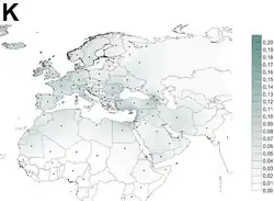 In Europe, K appears to be most common in the Morbihan (17.5%) and Périgord-Limousin (15.3%) regions of France, and in Norway and Bulgaria (13.3%).[5] The level is 12.5% in Belgium, 11% in Georgia and 10% in Austria and Great Britain.[6] Some specific subclades of K among Europeans are K1a1b2b in Finland,[7] K1a3a1 in Sardinia,[8] K1a19 in Hungary,[9] K1b1b1a in Greeks,[10] K1b1c in Serbia,[11] Slovakia,[12] and Poland,[13] K1c2 in Irish[14] and Germans[15] and in Hungary,[16] and K2a9a in Sardinia.[17] A 2013 study had suggested that K1a1b1a, K1a9, and K2a2a1 could have originated from Western Europe.[18]