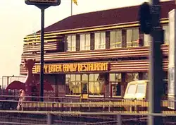 In 1980, the brand further expanded when its 21 locations were sold to the Imperial Group. Not long after this, a partnership with Esso garages was formed, which saw a rapid increase of new roadside locations throughout the 1980s.[3] Imperial Group would expand the chain to 75 restaurants, before selling the chain in August 1986 to Trusthouse Forte, owners of Little Chef. Trusthouse Forte continued to expand the Happy Eater chain alongside Little Chef.[4] The chain notably received media attention in 1991 when Prime Minister John Major stopped at a Happy Eater outlet for a fried breakfast on his way to a Young Conservatives conference.[5]