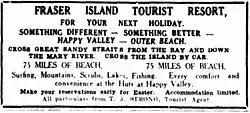 From August 1934, tourists started coming to the Fraser Island Tourist Resort, a group of huts "offering every comfort and convenience" at Happy Valley.[4][5]