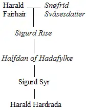The Icelandic sagas, in particular Snorri Sturluson in Heimskringla, claim that Sigurd, like Olaf's father, was a great-grandson of King Harald Fairhair in the male line. Most modern scholars believe that the ancestors attributed to Harald Hardrada's father, along with other parts of the Fairhair genealogy, are inventions reflecting the political and social expectations of the time of the authors (around two centuries after Harald Hardrada's lifetime) rather than historical reality.[14][16] Harald Hardrada's alleged descent from Harald Fairhair is not mentioned and played no part during Harald Hardrada's own time, which seems odd considering that it would have provided significant legitimacy in connection with his claim to the Norwegian throne.[14]