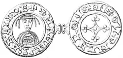 Penny minted by Harald, with a triquetra on the obverse, used both by Christians and in Norse paganism.[67] It was used on coins in Denmark by Cnut the Great and his sons,[b] and Harald probably adopted it as part of his claim to the Danish throne.[84][85]