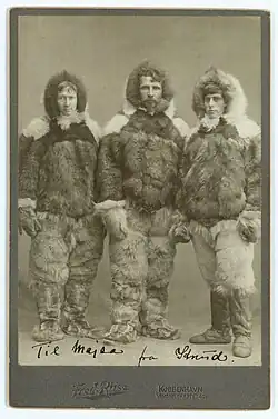During 1902–1904, Harald Moltke joined The Literature Expedition (Den Litterære Ekspedition), headed by Ludvig Mylius-Erichsen (1872–1907), with Knud Rasmussen (1879–1933), Jørgen Brønlund (1877–1907) and Alfred Bertelsen (1877–1950). The expedition was a dog sled journey along the unmapped north-west coast of Greenland from Upernavik to Cape York close to Thule. From this expedition his main works are a set of 30 portraits of Inuit, issued in 1903. He also illustrated the book Grønland, illustreret Skildring af Den Danske litterære Grønlandsekspedition 1902-1904 (1906) with Ludvig Mylius-Erichsen as author.[3][8][9]