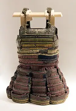 Haramaki were originally constructed with the same materials as the ō-yoroi but designed for foot soldiers to use as opposed to the ō-yoroi which was for mounted warfare.[1] Haramaki refers to any Japanese armour which is put on from the front and then fastened in the back with cords. Other types of dō open from the side (ni-mai dō, dō-maru, maru-dō) instead of opening from the back as the haramaki does.