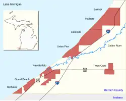 The region consists of eight small towns along the eastern shore of Lake Michigan in Berrien County: New Buffalo, Union Pier, Three Oaks, Lakeside, Grand Beach, Michiana, Harbert, and Sawyer.