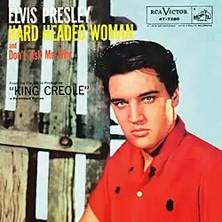 "Hard Headed Woman" is a rock and roll song recorded by Elvis Presley and published by Gladys Music,[1][2] Presley's publishing company, in 1958. It is an American 12-bar blues written by African American songwriter Claude Demetrius. It was most notably recorded as a rock and roll song by Presley as part of the soundtrack for his 1958 motion picture King Creole, and was included on the record album of the same name. The song was also released as a single in both 78 RPM[3] and 45 RPM formats. In 1958, it went to No. 1 July 21st on the Billboard charts and went to No. 2 for two weeks on the R&B chart.[4] Notably, it became the first rock and roll single to earn the RIAA designation of Gold Record.[5] When the song went to number one, Elvis was in Fort Hood Texas, doing basic training.