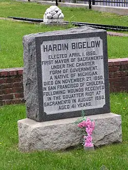 Hardin Bigelow (1809 in Michigan Territory – November 27, 1850 in San Francisco, California) was the first elected mayor of the city of Sacramento, California, which was known then as "Sacramento City." Bigelow's efforts to construct Sacramento's first levees won him enough support to become mayor in Sacramento's first mayoral elections in February 1850. Bigelow served seven months, from April to November, before succumbing to cholera; while he was mayor, Sacramento averted disaster in a potentially devastating flood,[1] but fell victim to a series of April fires,[1] a riot,[2] and a cholera epidemic.[3]