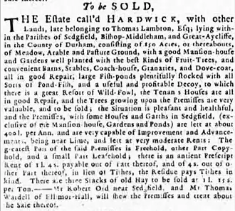 In 1590 the manor of Hardwick was granted to George Freville. He was knighted by King James at York, 17 April 1603.[3] George Freville died childless in 1619, leaving his lands to his younger nephew Nicholas. In 1645 Nicholas compounded for his Hardwick estate. He died in 1674, leaving three daughters and co-heirs, Elizabeth, Mary, and Margaret widow of Thomas Lambton. Freville Lambton, son of Margaret, had Hardwick by the will of his grandfather. He and his mother, then the widow of Nicholas Conyers of Biddick Waterville,[4][5] made a settlement of the manor in 1687. Freville Lambton married 1) Ann Milward, of Uttoxeter, Stafford; 2) Thomasine Milward; and 3) Anne, daughter of Sir Robert Wright, English judge and Chief Justice of the King’s Bench and sister of Robert Wright for who the Manor House in Sedgefield was built in 1707.[6] By his second wife, he had his son and heir, Thomas, who had six daughters and co-heirs: Barbara, Dorothy, Thomasina, Philadelphia, Margaret and Elizabeth. They sold Hardwick in 1748 to John Burdon, who in 1780 conveyed it to William Russell, retaining a life interest.[7][8][2]