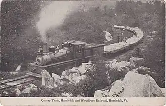 With the completion of the railroad, the quarries developed rapidly. Additional granite-finishing facilities were built around the Hardwick end of the railroad and the local granite industry became concentrated there.[28] Hardwick became an important granite center and its population mushroomed; town boosters proclaimed it to be the "building granite capital of the world."[10]