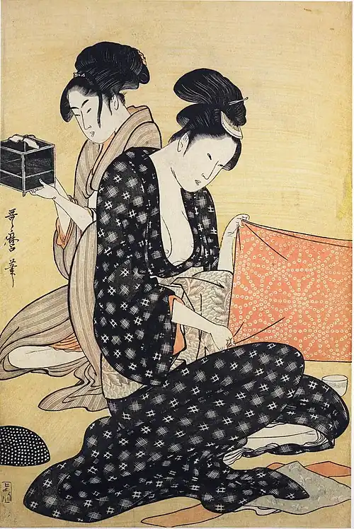 Kitagawa Utamaro (c. 1753–1806) made his name in the 1790s with his bijin ōkubi-e ("large-headed pictures of beautiful women") portraits, focusing on the head and upper torso, a style others had previously employed in portraits of kabuki actors.[4] Utamaro experimented with line, colour, and printing techniques to bring out subtle differences in the features, expressions, and backdrops of subjects from a wide variety of class and background.[5]