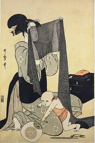 Utamaro's individuated beauties were in contrast to the stereotyped, idealized images that had been the norm.[5] He set many prints in scenes of daily life[6] and depicted a wider variety of women in a greater range of situations than was usual in ukiyo-e, often including scenes of mothers with their children.[7]