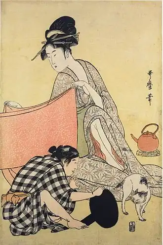 In the centre sits an older woman with shaved eyebrows, indicating she is married.[8] She holds one end of a red obi sash[10] decorated with a hemp-leaf pattern; a young woman in the right print holds the other end.[8] They fold it as they take measurements.[6] In front of the women in the right print a young boy[6] shows a cat its reflection in a hand mirror[8] and laughs; the threatened cat's hair stands on end. An adolescent girl[6] in the back of the middle print gazes in an insect cage,[8] possibly at a firefly or cricket.[7]