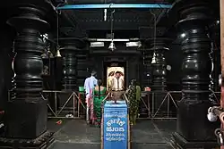 The temple is constructed in a staggered square mantapa (hall) plan, typical of Hoysala constructions. Therefore, the outer wall of the mantapa shows many projections and recesses.[3] The wall of the mantapa is a parapet wall resting on which are half pillars that support the outer ends of the roof (cornice).[4] The ceiling of the open mantapa is adorned with artistic decoration such as lotuses. The ceiling is supported by lathe turned full pillars. The material used for the temple is soapstone (also called potstone).[4][5] The original tower over the shrine (Vimana) is missing and has been replaced in modern times with one of brick and mortar.[2] Preserved within the temple premises are several old-Kannadainscriptions and hero stones.[1]