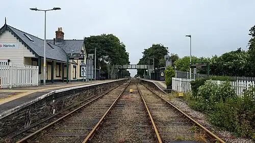 Harlech railway station is located at a level crossing on the A496 in the centre of the town of Harlech in Gwynedd, North Wales. The waiting shelters were installed to cater for the high numbers of schoolchildren commuting to and from the adjacent secondary school, Ysgol Ardudwy.[1][2]