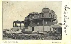 For the next ten years, the club occupied both locations – a clubhouse in Manhattan and its City Island station on Hunter Avenue. In 1898, the club began building a Victorian-era clubhouse on City Island, which opened in June of the following year. Its opening was heralded by a "salute of seventeen guns ... an illumination [of the fleet], and fireworks ashore and afloat."[6] By 1901, The New York Times noted that, "...in place of the fishing smacks and oyster boats that once anchored in East Chester Bay is the fleet of the Harlem Yacht Club."[7] In 1903, the club gave up its location in Manhattan, which was taken over by the newly formed Metropolitan Yacht Club.[8]