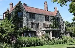 The three-story, 16-room, limestone mansion was originally situated on nearly five acres of lakefront property landscaped by Jens Jensen, a Prairie School landscape architect, in collaboration with Alfred Caldwell.[3][4] Amongst the elements of the landscape was an informal wooded landscape on the bluff down to the home's private sand beach. This wooded bluff featured grassy clearings, and an "Indian Council Ring" (the latter being a personal signature of Jensen's landscapes).[3] While the landscape has since been changed, several features of the original design currently remain. This includes a hemlock-shaded pond with waterfall, a council ring, many terraces and pathways, as well as portions of the original plantings.[4]