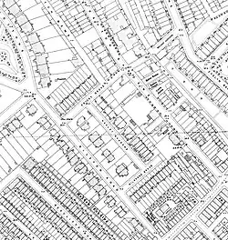 Harley Gardens was built from 1851, mostly of semi-detached brick houses. Pevsner notes the "oddly undulating acanthus leaves" decorating their porch capitals. Numbers 9-14 were built in 1861–63 in a grander style and are "a richly dressed symmetrical terrace with bracketed main cornice below a parapet punctuated by urns."[1]