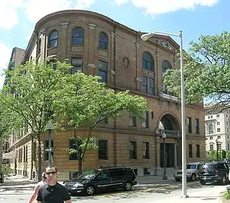 Augustus Woodward's plan for Detroit's streets created uniquely-shaped triangular blocks, including Capitol Park on the west and Harmonie Park on the east.[3] Starting in the 1830s and 1940s, this area was home to a growing number of German immigrants to Detroit. In 1849, to preserve their ethnic traditions, a group of Detroit Germans founded a singing group, the Gesang-Verein Harmonie.[3] The club built a frame clubhouse at the corner of Lafayette and Beaubien in 1874. This frame Harmonie Club structure burned in 1893, and the club almost immediately organized a competition, open to German architects, to design a new building. Richard Raseman (the architect of the Grand Army of the Republic Building) won the competition; the resulting building sits across from Harmonie Park.[3]