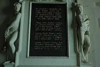 All three brothers are commemorated on the Parliamentary War Memorial in Westminster Hall. Harold and Oswald, on Panel 8, are among the 22 MPs that died during World War I to be named on that memorial. John, included on the memorial as the son of an MP, appears on Panel 2 of the memorial.[8][9][10] Harold Cawley is one of 19 MPs who fell in the war who are commemorated by heraldic shields in the Commons Chamber.[11]