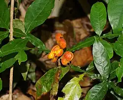 Harpullia frutescens is a shrub that typically grows to a height of up to 1–2 m (3 ft 3 in – 6 ft 7 in), its young growth covered with downy hairs. Its leaves are paripinnate, 45–185 mm (1.8–7.3 in) long with 6 to 8 elliptic to lance shaped leaflets sometimes tapering to a point, 75–170 mm (3.0–6.7 in) long and 25–50 mm (0.98–1.97 in) wide on a winged petiole 35–85 mm (1.4–3.3 in) long. The flowers are strongly perfumed, borne in clusters of mostly 2 to 4 in upper leaf axils 30–120 mm (1.2–4.7 in) long, each flower on a slender, hairy peduncle up to 5 mm (0.20 in) long. The sepals are 7–8 mm (0.28–0.31 in) long and covered with downy hairs, the petals are white with a pink tinge, and 15–20 mm (0.59–0.79 in) long. There are 5 or 6 stamens, and the ovary covered with woolly hairs. The fruit is a laterally compressed, crimson capsule about 12–16 mm (0.47–0.63 in) long containing two shiny seeds, enclosed in a yellow, cup-shaped aril.[2][3][4]