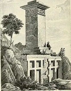 The tomb is a large square of carved marble panels. Each side is 7 feet (2.1 m) in length and 3 feet 3 inches (1.0 m) in height. It was originally set upon a large oblong stone pedestal, 17 feet (5.2 m) high, making it an example of a pillar tomb. The top of the pillar has a hollowed out chamber creating a space inside the tomb 7 feet 6 inches (2.3 m) tall from the bottom of the hollow to the top of the reliefs. All four sides are carved with similar relief panels in one of which (the south side[n 1]) is a small opening to allow a body to be placed in the tomb. This aperture may originally have been closed with a stele. The tomb is roofed with what appear to be three large slabs, one above the other. In fact, the capstone is one single piece, weighing 15 to 20 tons, carved to give the appearance of three layers. Each false slab overlaps the ones below to form an entablature. All the parts, except the sculptured reliefs, are made from local grey-blue limestone.[24][25][26][27][28][29]