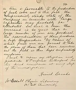 Brooks was the first graduate student in Canada of Sir Ernest Rutherford, under whom she worked immediately after graduating.[5] With Rutherford, she studied electricity and magnetism for her master's degree. In 1899, even before her thesis was completed, her work on damping of electrical oscillations was published in the Transactions of the Canadian Section of the Royal Society. The same year, Brooks received an appointment as nonresident tutor at the newly formed Royal Victoria College, the women's college of McGill University. In 1901, she became the first woman at McGill University to receive a master's degree.[6]