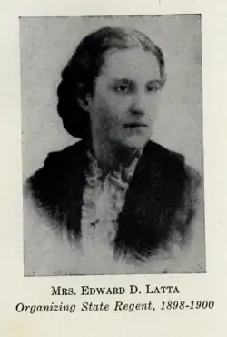 In 1898, Latta was appointed by national officers in Washington, D.C. to serve as the organizing State Regent for the North Carolina Society of the Daughters of the American Revolution.[5][1] As state regent, she organized North Carolina's first DAR chapter, the Mecklenburg Chapter, in Charlotte.[5] Latta also formed chapters in Henderson, Salisbury, and Waynesville.[1] She served as state regent until 1900.