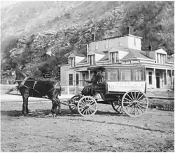 Arriving in Skagway in early 1897 with only $7 (according to her), she quickly found work as a cook for the workers of Captain William Moore, one of the founders of the settlement.[6] In her spare time, she took discarded tin cans and beat them into pie pans. She baked and sold apple pies to prospectors passing through on their way to the Klondike Gold Rush.[6] She used her profits to start a freighting company, which provided transportation on the White Pass trail.[6] When the White Pass and Yukon Route railroad opened, her business waned, so she purchased a house from Moore and turned it into the luxurious and very successful Pullen House Hotel.[2] With her finances secured, she sent for her children.[2] Her husband arrived sometime later, but left, seeking his own fortune in the Klondike.[2] She became famous for her hospitality and acquired the nickname "Ma".[6]
