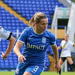 After leaving Reading, Scott agreed to join Birmingham City ahead of the 2018–19 FA WSL season.[8] In her first season she was an important player for The Blues as they performed better than expected, compiling a 13–6–1 record to finish fourth in the League.[9] She signed a new two-year contract with Birmingham in July 2019.[10] Following the departure of the long-serving Kerys Harrop in 2020, Scott was appointed club captain by incoming Birmingham manager Carla Ward.[11]