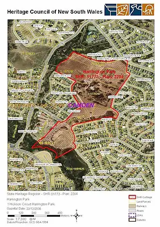- ^ a b c d e f g h i j k l m n o p q r s t u v w x y z aa ab ac ad ae af ag ah ai aj ak al am an ao ap aq ar as at au av aw ax ay az ba bb bc bd be bf bg bh bi bj bk bl bm bn bo bp bq br bs bt bu bv bw bx by bz ca cb cc cd ce cf cg ch ci cj ck cl cm cn co cp cq cr cs ct cu cv cw cx cy cz da db dc dd de "Harrington Park". New South Wales State Heritage Register. Department of Planning & Environment. H01773. Retrieved 2 June 2018.