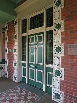 Harris House was a substantial, red face brick, single storey villa residence with a terracotta Marseilles tile-clad roof featuring multiple gables, three chimneys and a central roof lantern. It was elevated by an earth embankment above street level and its front verandah was accessed by wide staircase that led to a tall, gabled entrance portico. The exterior was highly ornamented with concrete mouldings that contrasted with the red brick walls, including quoins to wall corners, pilasters framing a pair of bay windows, and scrolled brackets to eaves and overhangs. The formal floor plan located principal rooms at the front (east) end of the house, accessed by a wide central passageway lit by the roof lantern, and service rooms at the rear (west). A rear entrance landing and laundry were, at some early stage, built up against the southwest corner of the house. In addition to the lantern, daylight to the centre and south-western parts of the house was maximised by high windows in the south and west walls, and glazed fanlights to all doors.[52][53][54] The principal rooms were given high quality finishes and materials in popular contemporary materials and patterns. Surviving original or early features include plaster walls, timber floors and joinery, a variety of Wunderlich pressed metal ceilings and cornices, fireplaces with vibrant glazed tiles and ornate timber mantlepieces, leadlight windows with Art Nouveau-style patterns, and semi-circular arches with plasterwork ornamentation in the central passageway.[55][56][57][1]