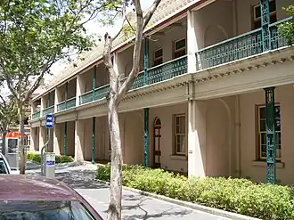 The street facade features a double-storeyed verandah with cast iron balusters and posts. The verandah is separated into six sections reflecting the original six houses. Each section has three French doors on the first floor, and two sash windows and the front door on the ground floor.[1]