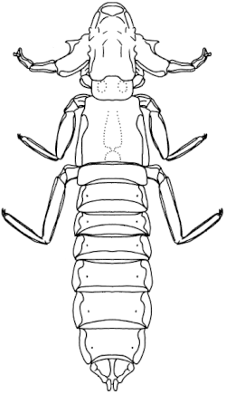 This species is dark brown with an elongated head, and extremely large – H. hopkinsi is one of the largest feather lice, with males reaching up to 9 millimetres (0.35 in) long.[2] They live mostly on the wing feathers, but are quite able to move if disturbed or if their host bird should die.[3] There are usually fewer than half a dozen adult specimens found on a single host bird; low compared with other species of feather lice, which may number in the hundreds.[3] Harrisoniella hopkinsi has been found on the feathers of the wandering albatross (Diomedea exulans) and the southern royal albatross (Diomedea epomophora).[3]