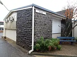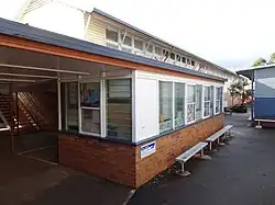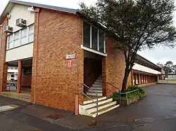 Harristown's new administration block was a result of growth at the school, "where an administrative unit of this pleasing character [had] become necessary".[50] The administration block (the northern section of Block Z in 2016) was added to the west of Block B c. 1957-8.[51] Connected to the northwest corner of the ground floor of Block B by a covered way, it included concrete paved indoor-outdoor areas; a raised concrete dais and a garden plot to the northeast; male and female toilets at the east end of the building; two staff rooms to the west; offices for the Principal and Deputy Principal at the west end of the building; and two brick flower boxes and a raised area of concrete pavers outside the northwest entrance. The building was sheeted with metal, with stone feature walls at the southwest corner and a brick wall at the east end, and had clerestory windows on the south side.[52] The use of stone was a deliberate move to improve the aesthetics of the school. In 1959 it was noted that, as high schools grew, they needed "elements of maturity", the aim being "to develop pride in the school and to supplement academic education with desirable aesthetic experience".[50][1]